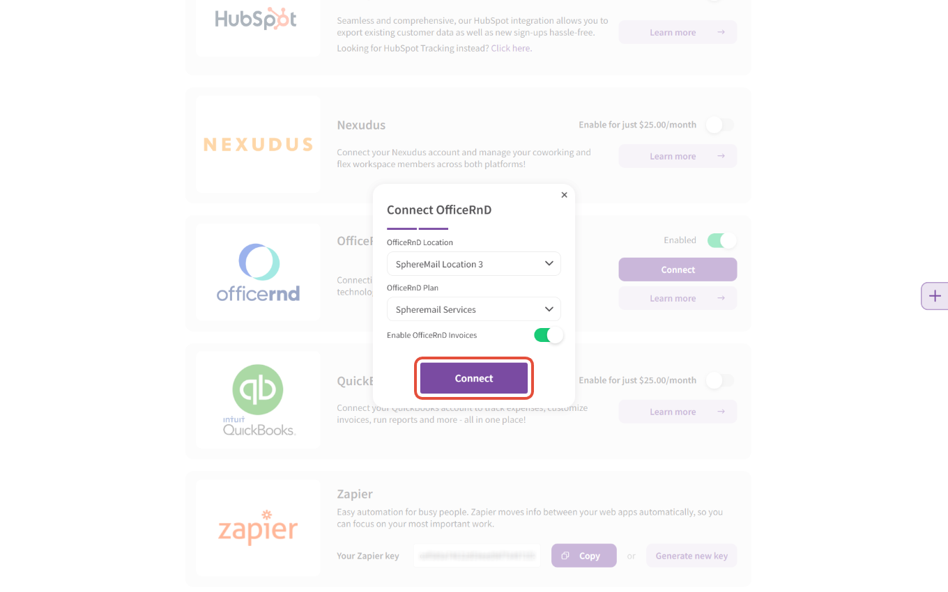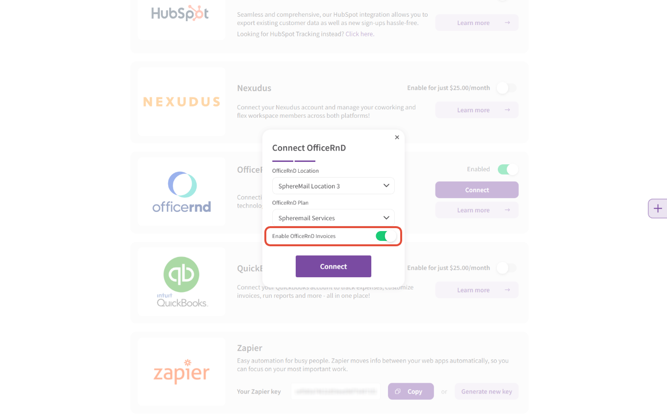 - Finally, you'll find the option to enable OfficeRnD invoices; enabling this toggle will have SphereMail automatically export your active customers' pending charges to their connected OfficeRnD accounts so you can handle their billing there: